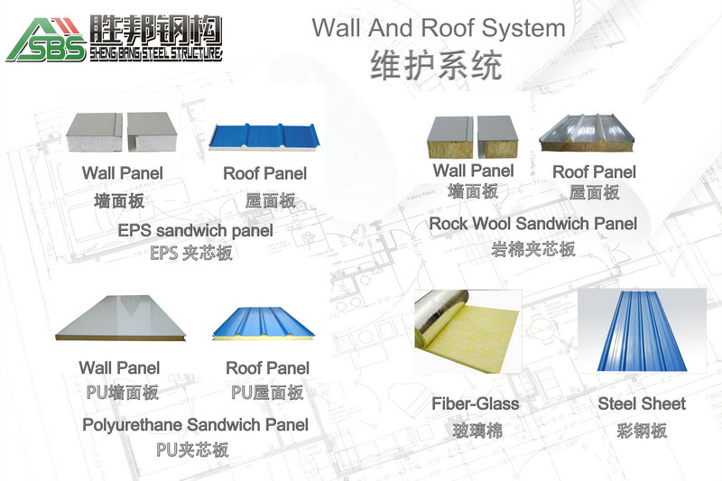 6)墻和屋頂材料是可選的:波紋鋼板,EPS夾芯板,巖棉夾芯板和聚氨酯夾層板。