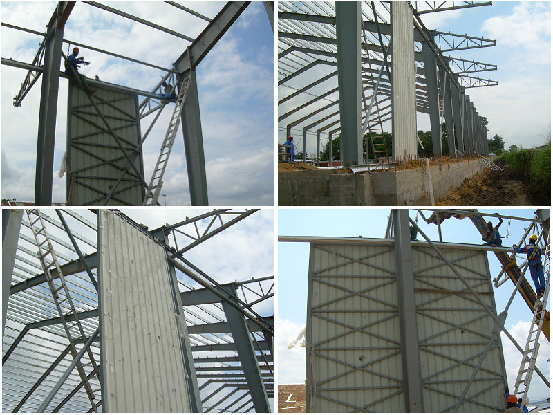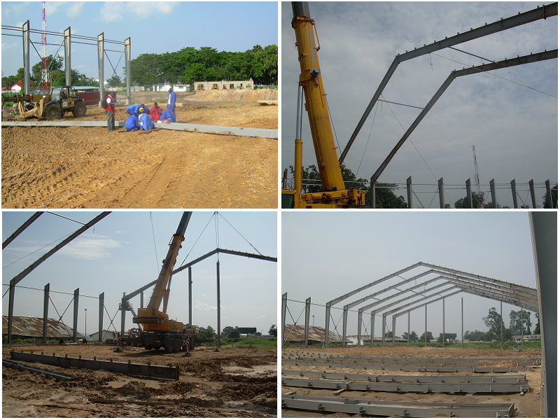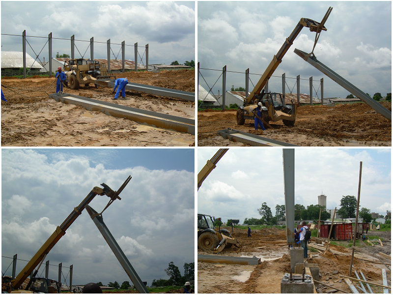 剛果倉庫位于非洲,占地面積3500平方米。主體框架用H型變截鋼制作完成。所有鋼架結構均由螺栓連接;A離地面1米以作為防水臺。以下為部分建筑圖片展示:
