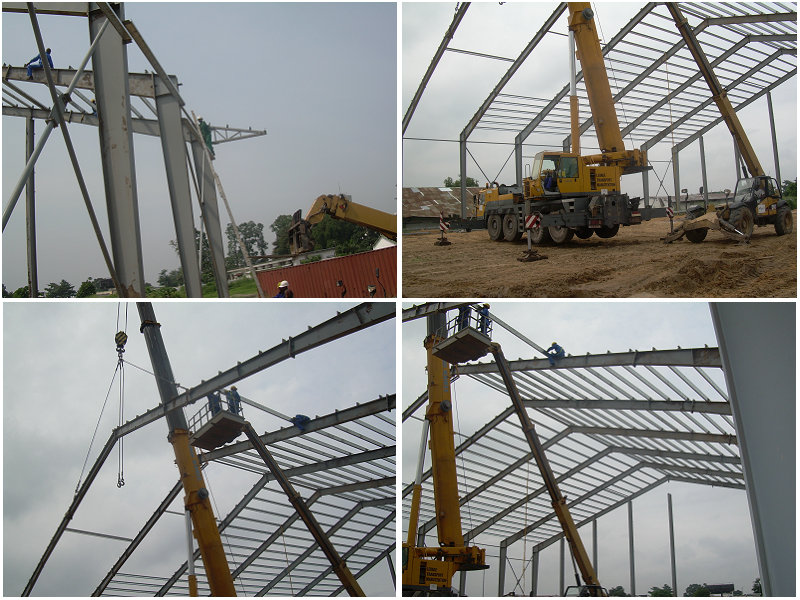 剛果倉庫位于非洲,占地面積3500平方米。主體框架用H型變截鋼制作完成。所有鋼架結構均由螺栓連接;A離地面1米以作為防水臺。以下為部分建筑圖片展示: